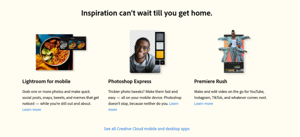 Creative Cloud All Apps is Adobe’s flagship product. Its existing page was transactional, driven by deals, app lists, and prices. The challenge: Craft a warmer, more aspirational version to test. Our version won, hands down. Role: Senior Copywriter/Consultant.