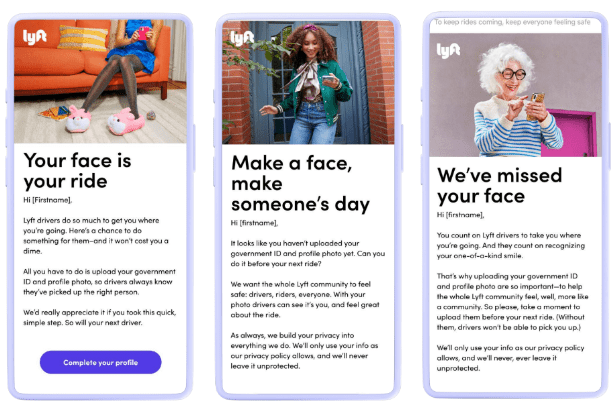 This in-app campaign walks Lyft riders through uploading a profile photo that drivers can match to their faces. The process can feel like a chore. Our challenge: make it easy and friendly. Role: Senior Copywriter/Consultant.